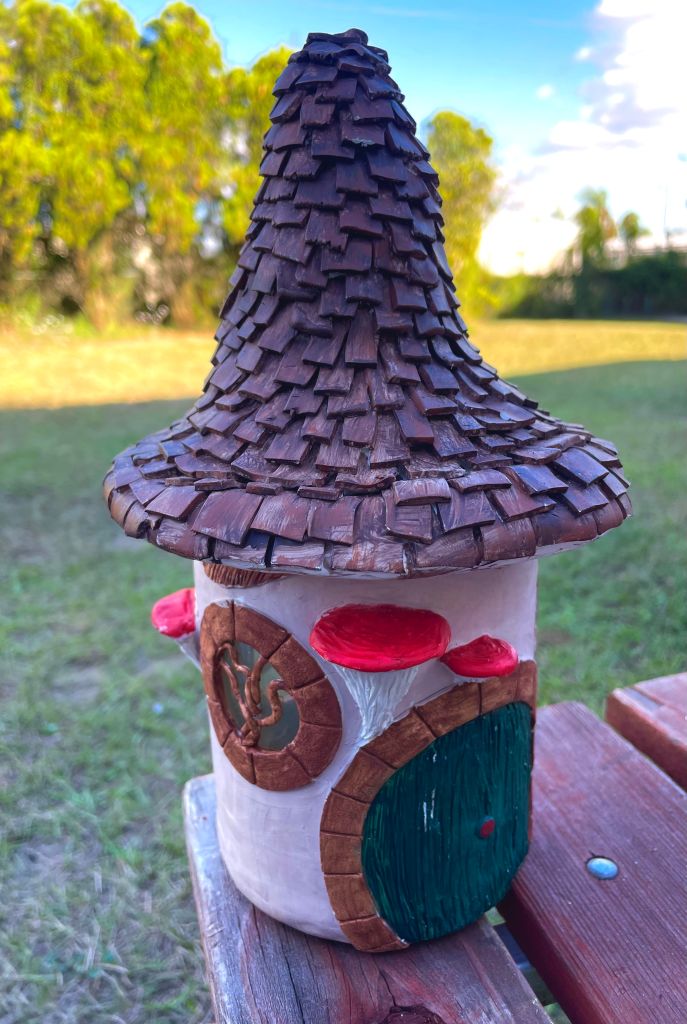 Hand crafted Fairy Home using a mix between recycled material and Polymer Clay. Use as a stash jar, or Night Light. Preferred use indoors or under cover away from the elements. Product comes with a strand of lights