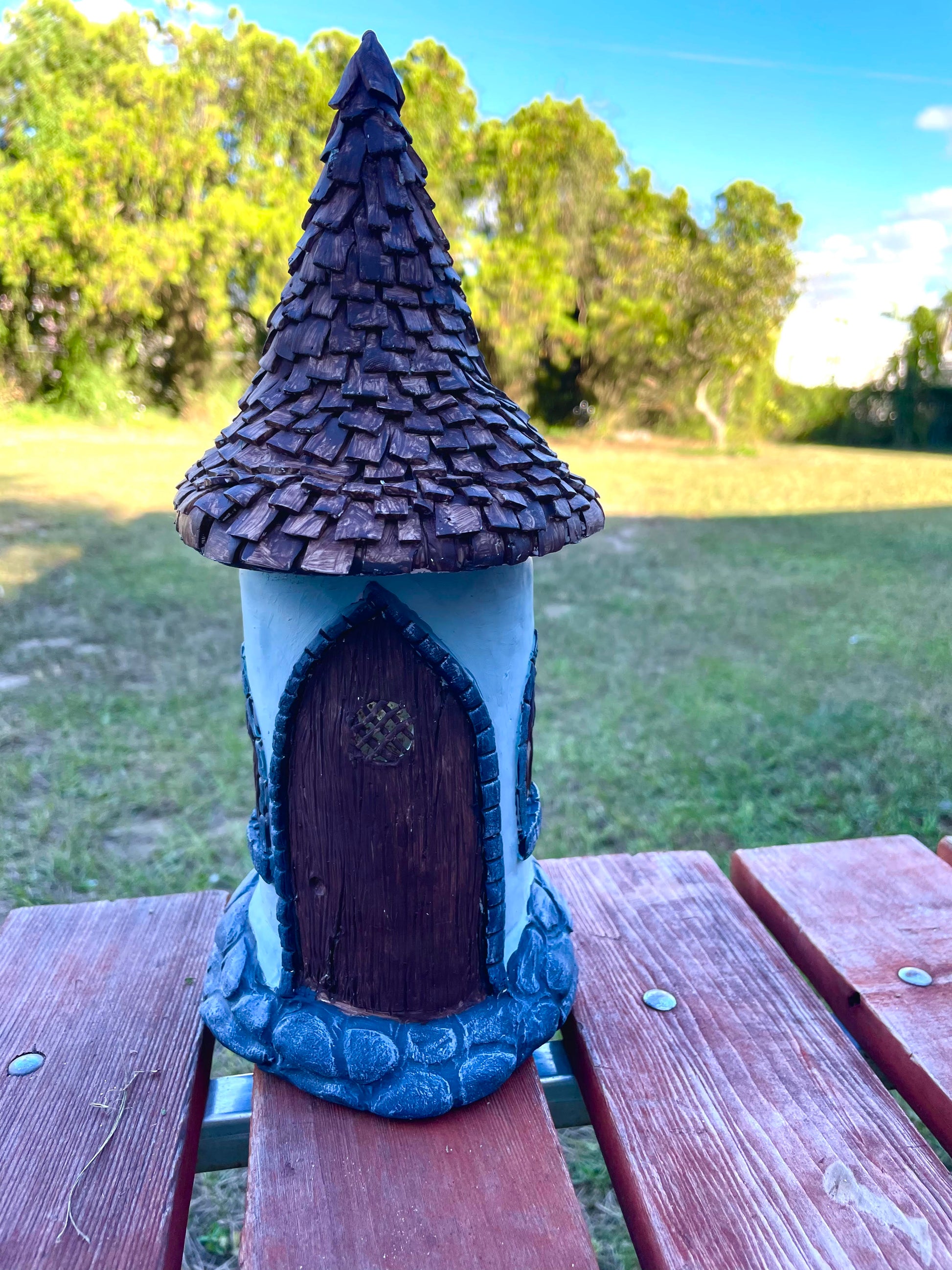 Hand crafted Fairy Home using a mix between recycled material and Polymer Clay. Use as a stash jar, or Night Light. Preferred use indoors or under cover away from the elements. Product comes with a strand of lights.